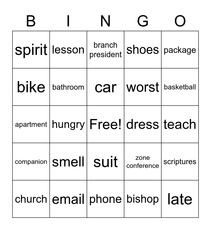 This bingo card has a free space and 45 words: early, late, neighbor, church, youth, bishop, branch president, APs, package, email, shoes, dress, suit, smell, cold, phone, prank, apartment, p-day, basketball, lesson, knock, gross, spirit, new member, teach, baptism, district, zone conference, companion, study, scriptures, laugh, tired, sleep, hungry, walk, mission president, zone leader, car, bike, worst, best, bathroom and mess.