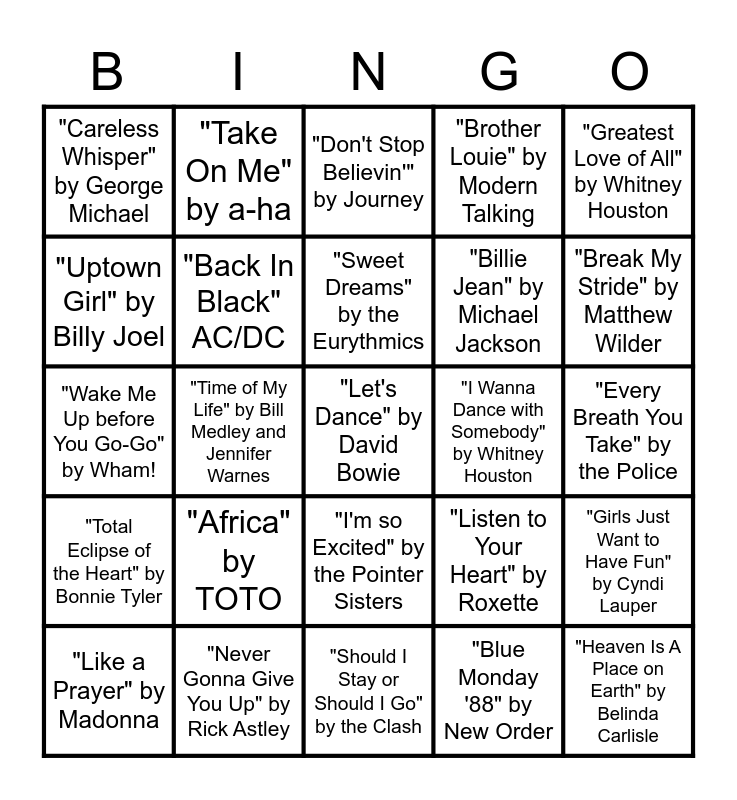 This bingo card has 25 words: "Africa" by TOTO, "Should I Stay or Should I Go" by the Clash, "Sweet Dreams" by the Eurythmics, "Like a Prayer" by Madonna, "Greatest Love of All" by Whitney Houston, "Careless Whisper" by George Michael, "Uptown Girl" by Billy Joel, "Take On Me" by a-ha, "I Wanna Dance with Somebody" by Whitney Houston, "I'm so Excited" by the Pointer Sisters, "Billie Jean" by Michael Jackson, "Wake Me Up before You Go-Go" by Wham!, "Listen to Your Heart" by Roxette, "Girls Just Want to Have Fun" by Cyndi Lauper, "Back In Black" AC/DC, "Heaven Is A Place on Earth" by Belinda Carlisle, "Every Breath You Take" by the Police, "Don't Stop Believin'" by Journey, "Break My Stride" by Matthew Wilder, "Time of My Life" by Bill Medley and Jennifer Warnes, "Let's Dance" by David Bowie, "Never Gonna Give You Up" by Rick Astley, "Total Eclipse of the Heart" by Bonnie Tyler, "Brother Louie" by Modern Talking and "Blue Monday '88" by New Order.