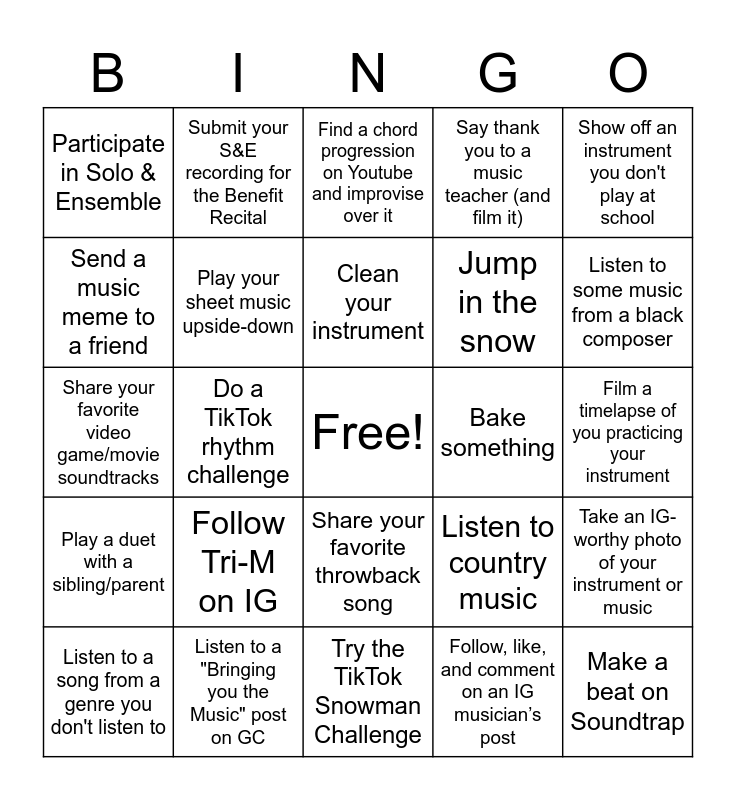 This bingo card has a free space and 24 words: Follow Tri-M on IG, Listen to a "Bringing you the Music" post on GC, Clean your instrument, Listen to a song from a genre you don't listen to, Show off an instrument you don't play at school, Participate in Solo & Ensemble, Send a music meme to a friend, Submit your S&E recording for the Benefit Recital, Bake something, Share your favorite throwback song, Jump in the snow, Share your favorite video game/movie soundtracks, Listen to country music, Take an IG-worthy photo of your instrument or music, Play your sheet music upside-down, Follow, like, and comment on an IG musician’s post, Film a timelapse of you practicing your instrument, Find a chord progression on Youtube and improvise over it, Listen to some music from a black composer, Do a TikTok rhythm challenge, Make a beat on Soundtrap, Play a duet with a sibling/parent, Say thank you to a music teacher (and film it) and Try the TikTok Snowman Challenge.