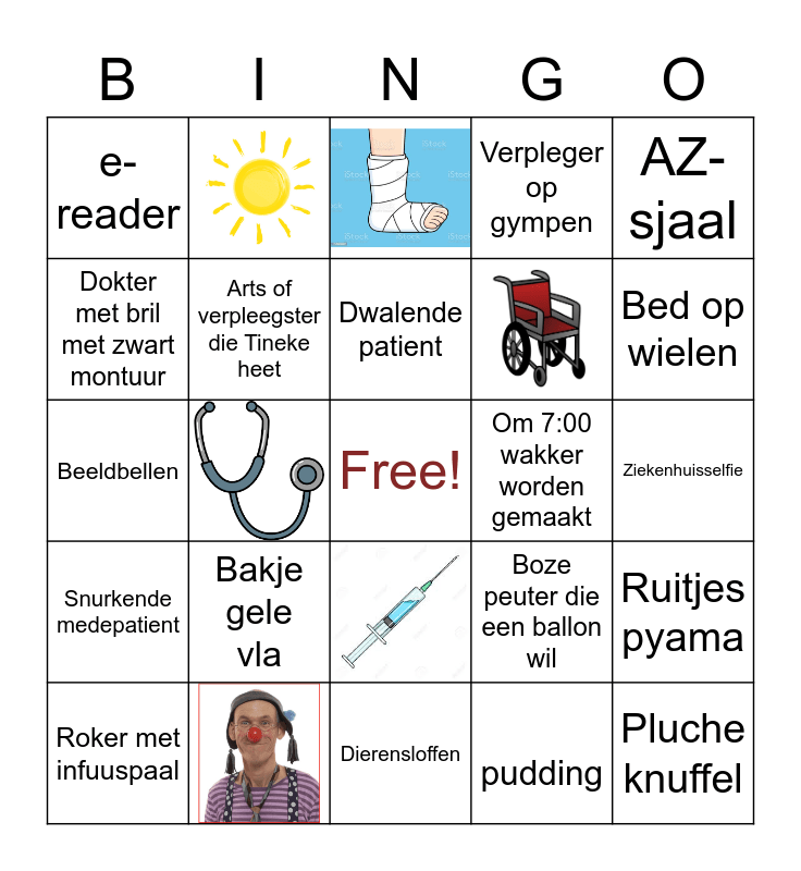 This bingo card has 6 images, a free space and 18 words: Bakje gele vla, Dwalende patient, Roker met infuuspaal, AZ-sjaal, e-reader, Dokter met bril met zwart montuur, Om 7:00 wakker worden gemaakt, Beeldbellen, Boze peuter die een ballon wil, Ruitjes pyama, Arts of verpleegster die Tineke heet, pudding, Ziekenhuisselfie, Bed op wielen, Pluche knuffel, Snurkende medepatient, Verpleger op gympen and Dierensloffen.