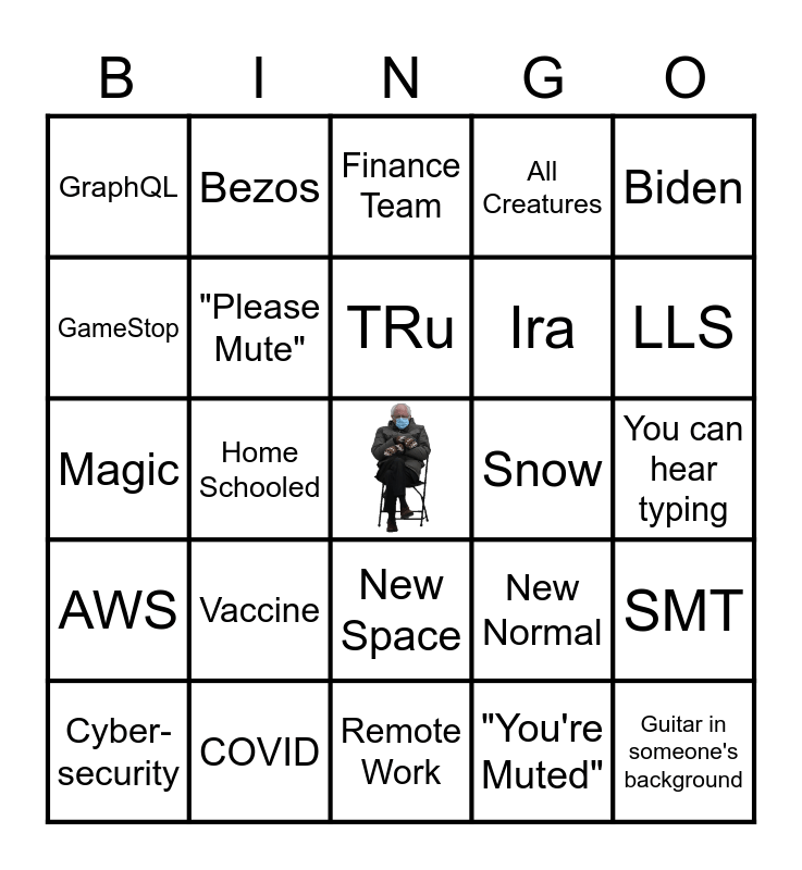 This bingo card has a free space and 24 words: Vaccine, COVID, TRu, Cyber-security, Biden, GraphQL, GameStop, Bezos, Snow, New Space, Ira, Magic, New Normal, SMT, "Please Mute", "You're Muted", You can hear typing, Finance Team, LLS, Home Schooled, Guitar in someone's background, AWS, All Creatures and Remote Work.