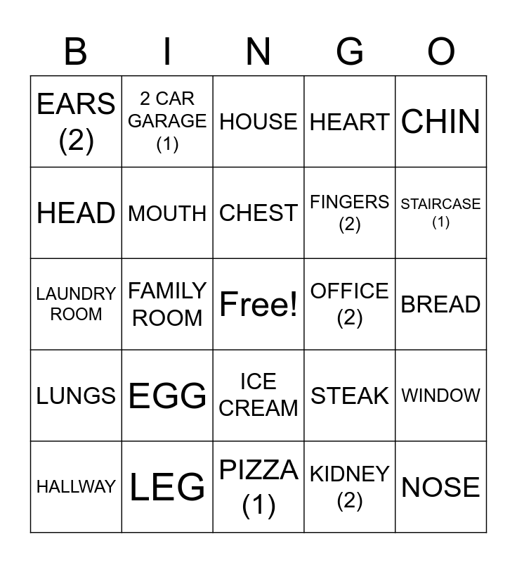 This bingo card has a free space and 60 words: HUMAN BODY, LEG, HAND, LUNGS, KIDNEY (2), EYES, MOUTH, TOES, FINGERS (2), KNEE, HEART, ARM (2), HEAD, STOMACH, LIVER, EARS (2), NOSE, CHIN, TEETH, CHEST, OFFICE (2), HOUSE, HALLWAY, WINDOW, GUEST BEDROOM, KITCHEN, DOOR, GARAGE, STAIRCASE (1), TOILET, LIVING ROOM (2), BATHROOM (1), WALL, GAMEROOM, 2 CAR GARAGE (1), MUDROOM, APARTMENT, FAMILY ROOM, DINING ROOM, LAUNDRY ROOM, CHEESE, EGG, BREAD, CHICKEN, STEAK, BACON, PASTA, DONUT (1), HOT DOG, ICE CREAM, PIZZA (1), HAM, FISH, MEAT (1), RICE, LASAGNA, POTATO CHIPS, FRENCH TOAST, HAMBURGER and LOBSTER.