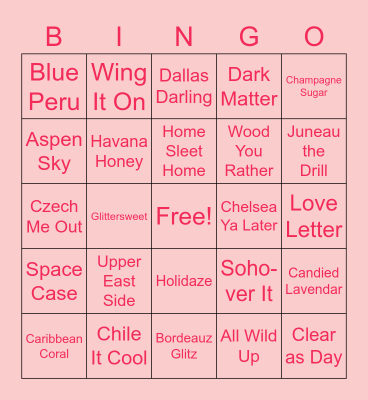 This bingo card has a free space and 70 words: It's a Key-per, Love Letter, Rose Goes, Heart of the Matter, Chile It Cool, Blushing in Flushing, Dark Matter, Light Year, Champagne Sugar, Pink Peppercorn, Candied Lavendar, I Want Scandi, Blue Peru, Dallas Darling, Crantastic, Glittersweet, Holidaze, Wood You Rather, How You Dune, Space Case, Chelsea Ya Later, Soho-ver It, Juneau the Drill, Scot Topic, Smoke's on You, Rustworthy, Suit Yourself, Plaid Reputation, All Wild Up, Snake My Day, Wing It On, Hiss and Make Up, Choose Hope, Brave and Beautiful, Never Forgotten, 1 in 4, Beijing Beauty, Charleston Blush, Giza Sands, Aspen Sky, Midnight in Manhattan, Upper East Side, Clear as Day, Manchester Mauve, Himalayan Salt, Havana Honey, Caribbean Coral, Greeking Out, Swiss and Tell, Berlin It to Win It, Tokyo Lights, Moon River, Capitol Hill, Sahara Jewel, Bordeauz Glitz, Only in Vegas, Home Sleet Home, Glamsterdam, Russian Around, Fort Worth It, Czech Me Out, Seattle Royale, You're Corally Invited, Ibiza Nights, Trend Spotted, Rule of Plum, French City of Love, French Meet Me in Paris, Coming Up Rose Gold and Dripping in Diamonds.