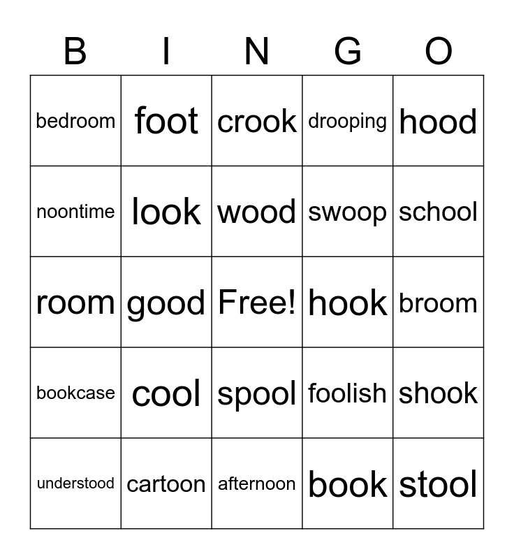 This bingo card has a free space and 32 words: book, stood, good, nook, bookcase, look, hood, shook, foot, lookbook, wood, crook, woodshed, brook, hook, fishhook, understood, room, spool, cool, foolish, pooch, broom, cartoon, stool, drooping, swoop, noontime, bedroom, afternoon, smooth and school.