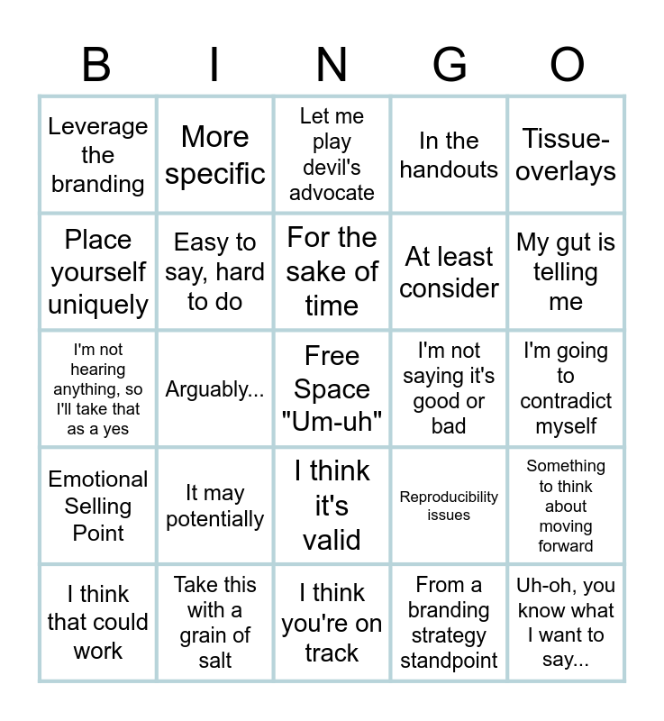 This bingo card has a free space and 24 words: It may potentially, Take this with a grain of salt, For the sake of time, I think that could work, Tissue-overlays, Leverage the branding, Place yourself uniquely, More specific, I'm not saying it's good or bad, I think it's valid, At least consider, I'm not hearing anything, so I'll take that as a yes, Reproducibility issues, Something to think about moving forward, Easy to say, hard to do, From a branding strategy standpoint, I'm going to contradict myself, Let me play devil's advocate, My gut is telling me, Arguably..., Uh-oh, you know what I want to say..., Emotional Selling Point, In the handouts and I think you're on track.