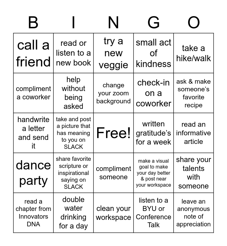 This bingo card has a free space and 25 words: dance party, double water drinking for a day, clean your workspace, listen to a BYU or Conference Talk, take a hike/walk, call a friend, read or listen to a new book, try a new veggie, written gratitude’s for a week, share your talents with someone, compliment a coworker, help without being asked, share an idea on how to make something better, make a visual goal to make your day better & post near your workspace, ask & make someone’s favorite recipe, read a chapter from Innovators DNA, take and post a picture that has meaning to you on SLACK, change your zoom background, check-in on a coworker, read an informative article, handwrite a letter and send it, share favorite scripture or inspirational saying on SLACK, compliment someone, small act of kindness and leave an anonymous note of appreciation.