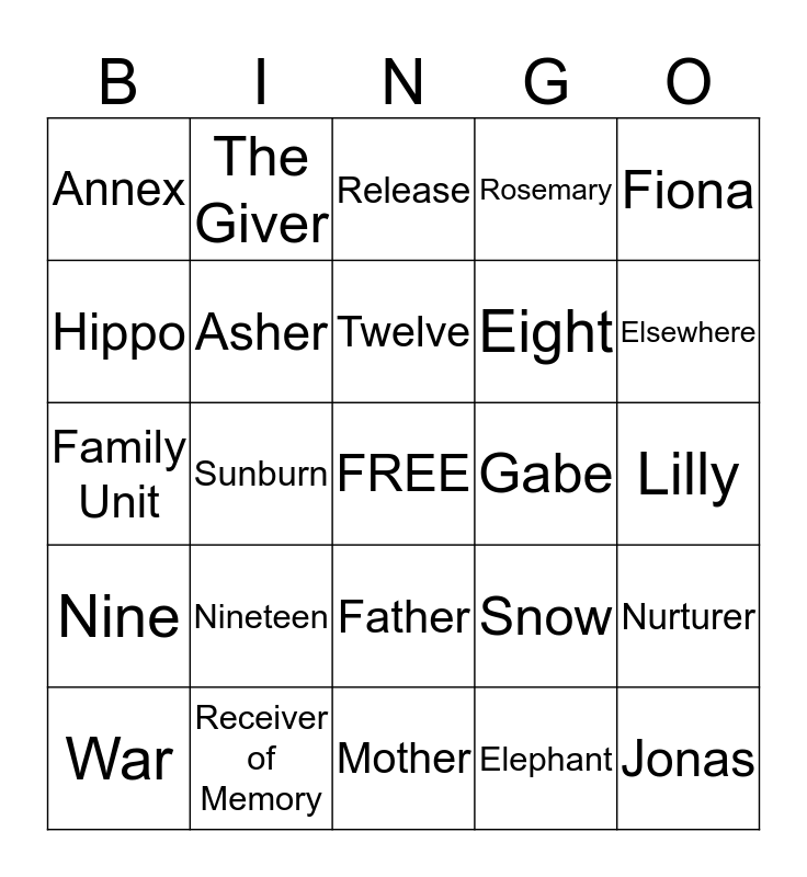 This bingo card has a free space and 24 words: Nineteen, Receiver of Memory, Twelve, War, Fiona, Annex, Hippo, The Giver, Gabe, Father, Eight, Family Unit, Snow, Nurturer, Asher, Elephant, Lilly, Release, Elsewhere, Sunburn, Jonas, Nine, Rosemary and Mother.