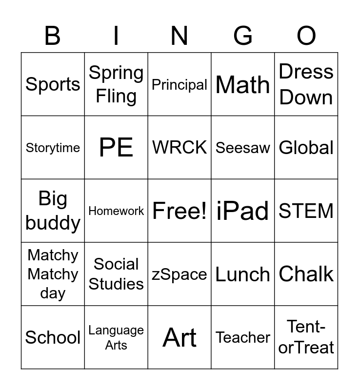 This bingo card has a free space and 55 words: Shamrocks, School, Church, Sports, Art, Music, PE, Spanish, Seesaw, Lexia, Math, Reading, Religion, Baptism, First Communion, Rock Pocket, Dress Down, Homework, Playground, Tent-orTreat, iPad, Recess, Lunch, Principal, Mr. Bobby, WRCK, Teacher, Student, STEM, Chalk, Brainpop, KaHoot, Splash, Epic, Storytime, Big buddy, Moby, Matchy Matchy day, Crazy socks, Bible, Spring Fling, STEM, Google Classroom, Science, Social Studies, Language Arts, Sycamore, Rock Report, Chromebook, Global, Green Screen, Kahn, Junior Achievement, zSpace and Sphero.
