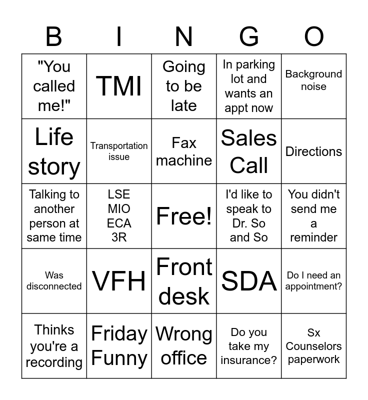 This bingo card has a free space and 25 words: VFH, Wrong office, Fax machine, Thinks you're a recording, Background noise, "You called me!", Life story, TMI, I'd like to speak to Dr. So and So, Front desk, Sales Call, Talking to another person at same time, SDA, Do I need an appointment?, Transportation issue, No one there, You didn't send me a reminder, Going to be late, Directions, LSE MIO ECA 3R, Sx Counselors paperwork, Friday Funny, Was disconnected, In parking lot and wants an appt now and Do you take my insurance?.