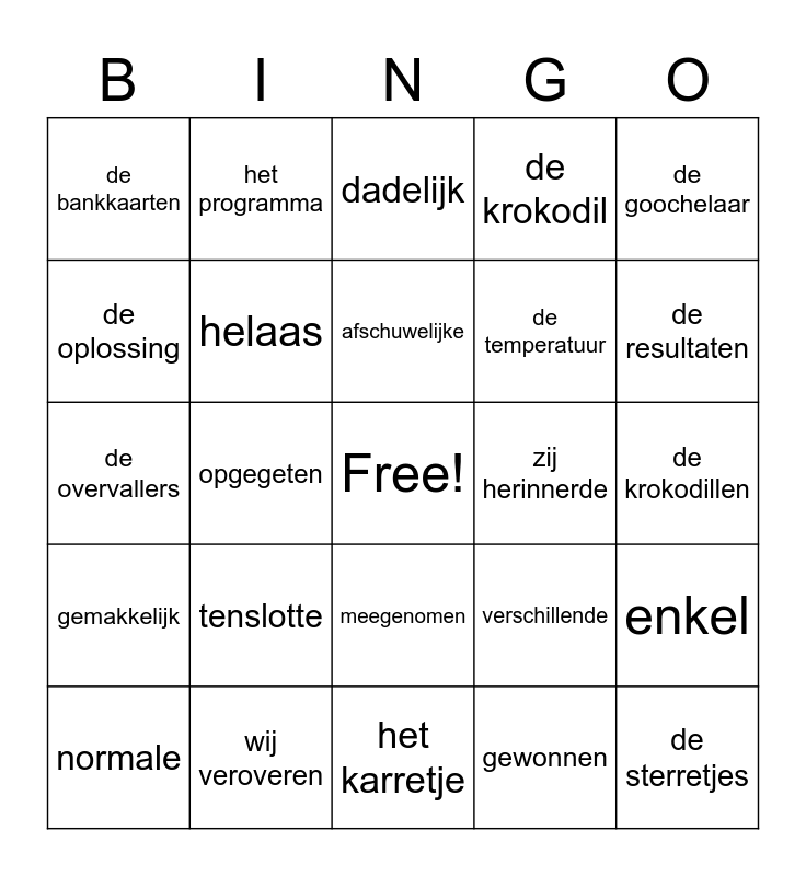 This bingo card has a free space and 119 words: de begrafenis, eerlijk, wij staren, heerlijk, tevreden, natuurlijk, de krokodil, vrolijk, het huwelijk, waarschijnlijk, de fantasie, gevaarlijke, het betekende, lelijke, aangekomen, moeilijke, meegenomen, oneerlijke, de juwelen, wonderlijke, normale, dadelijk, geschreven, duidelijk, enorme, gemakkelijk, wij veroveren, uiteindelijk, het publiek, vriendelijk, de resultaten, afschuwelijke, opgegeten, belachelijke, het fototoestel, mogelijke, zij amuseren, vreselijke, de supermarkt, aangevallen, aanleggen, binnenste, geschrokken, de raketten, de gabbers, de bestemming, zij herinnerde, gewonnen, de mummie, het karretje, de nachtmerrie, verschillende, stoffig, ondertussen, het rapport, verstoppertje, de vriendinnen, dolgelukkig, de sukkel, de avonturen, ondersteboven, de boterhammen, de datum, de gaskamer, gezellig, helaas, de problemen, supergrote, de temperatuur, de overvallers, hij huppelde, de krokodillen, de krukken, de ontploffing, bestuderen, de pannenkoek, de spinnenwebben, de sterretjes, tenslotte, de bankkaarten, sneeuwwit, het vissersschip, we goochelen, de zeemeerminnen, de blinddoek, teruggevonden, weggelopen, ze loochenen, het programma, de handdoeken, vannacht, weggooien, meegemaakt, de lotto, de oppas, de villa, de goochelaar, de veearts, het tempo, de beloning, de kleding, de ontdekking, de richting, de spanning, angstig, gevangen, ik bedank, we bedenken, enkele, de herinnering, de lading, de oplossing, plotseling, de verkenning, belangrijke, languit, de rechtbank, enkel and de zonsondergang.