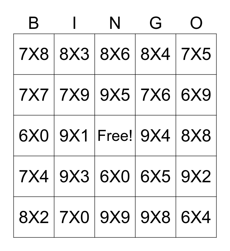 This bingo card has a free space and 24 words: 9X3, 7X0, 9X5, 8X2, 7X5, 7X8, 7X7, 8X3, 9X4, 6X0, 7X6, 6X0, 6X5, 9X2, 7X9, 9X8, 8X8, 8X6, 6X9, 9X1, 6X4, 7X4, 8X4 and 9X9.