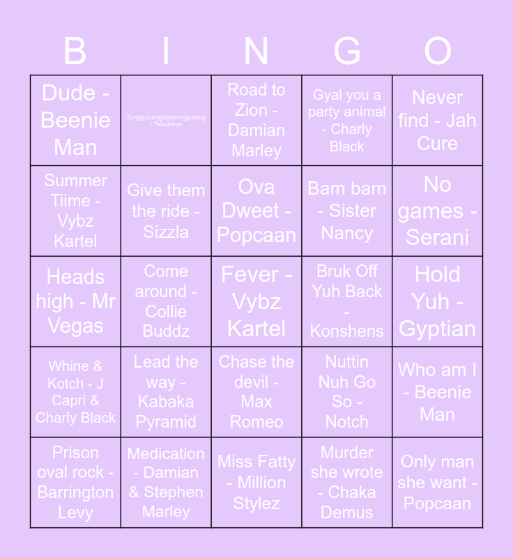 This bingo card has 30 words: Medication - Damian & Stephen Marley, Who knows - Protoje & Chronixx, Come around - Collie Buddz, Rude Bwoy Thing - Busy Signal, Dude - Beenie Man, Road to Zion - Damian Marley, Give them the ride - Sizzla, Chase the devil - Max Romeo, Bruk Off Yuh Back - Konshens, Miss Fatty - Million Stylez, Hold Yuh - Gyptian, Fever - Vybz Kartel, Murder she wrote - Chaka Demus, Only man she want - Popcaan, No games - Serani, Tempted to touch - Rupee, Nuttin Nuh Go So - Notch, Whine & Kotch - J Capri & Charly Black, Lead the way - Kabaka Pyramid, Never find - Jah Cure, Heads high - Mr Vegas, We can - Kranium & Tory Lanez, Zungguzungguguzungguzeng - Yellowman, Bam bam - Sister Nancy, Summer Tiime - Vybz Kartel, Gyal you a party animal - Charly Black, Who am I - Beenie Man, Prison oval rock - Barrington Levy, Ova Dweet - Popcaan and Nobody has to know - Kranium.