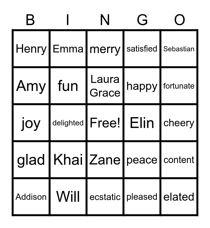 This bingo card has a free space and 24 words: Khai, Will, Laura Grace, Addison, Sebastian, Henry, Amy, Emma, Elin, Zane, happy, joy, peace, content, fun, pleased, cheery, merry, fortunate, delighted, elated, glad, satisfied and ecstatic.