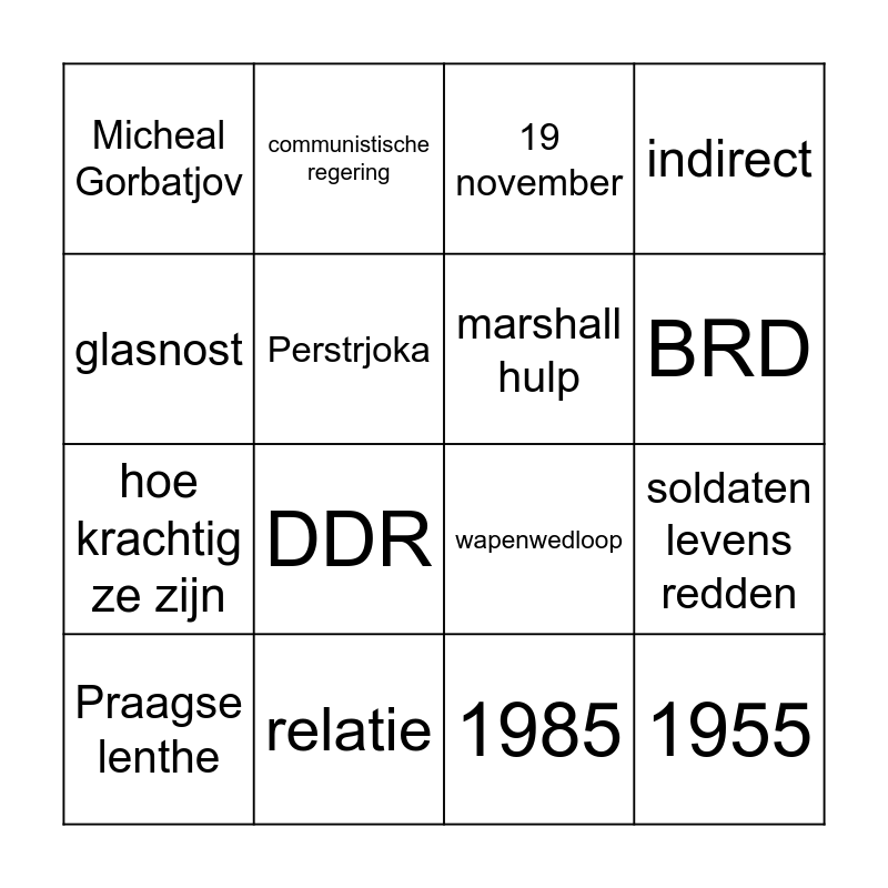 This bingo card has 16 words: relatie, soldaten levens redden, 19 november, Micheal Gorbatjov, hoe krachtig ze zijn, communistische regering, wapenwedloop, 1985, glasnost, Perstrjoka, Praagse lenthe, indirect, DDR, BRD, marshall hulp and 1955.