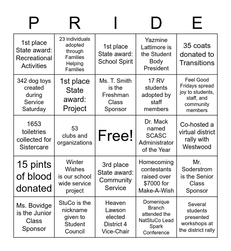 This bingo card has a free space and 30 words: StuCo is the nickname given to Student Council, 68 members of StuCo, 53 clubs and organizations, Recognized as a State Gold Honor Council, 1st place State award: Recreational Activities, 1st place State award: School Spirit, 1st place State award: Project, 3rd place State award: Community Service, Dr. Mack named SCASC Administrator of the Year, Heaven Lawson elected District 4 Vice-Chair, Co-hosted a virtual district rally with Westwood, Several students presented workshops at the district rally, Domenique Branch attended the NatStuCo Lead Spark Conference, Frontline workers were honored during Kindness Month, Feel Good Fridays spread joy to students, staff, and community members, Unity Day video created with student leaders across the district, Homecoming contestants raised over $7000 for Make-A-Wish, 15 pints of blood donated, Winter Wishes is our school wide service project, 35 coats donated to Transitions, 1653 toiletries collected for Sistercare, $3000 donated to Harvest Hope Food Bank, 23 individuals adopted through Families Helping Families, 17 RV students adopted by staff members, 342 dog toys created during Service Saturday, Yazmine Lattimore is the Student Body President, Mr. Soderstrom is the Senior Class Sponsor, Ms. Bovidge is the Junior Class Sponsor, Ms. T. Smith is the Freshman Class Sponsor and Ms. Auerbach is the Sophomore Class Sponsor.