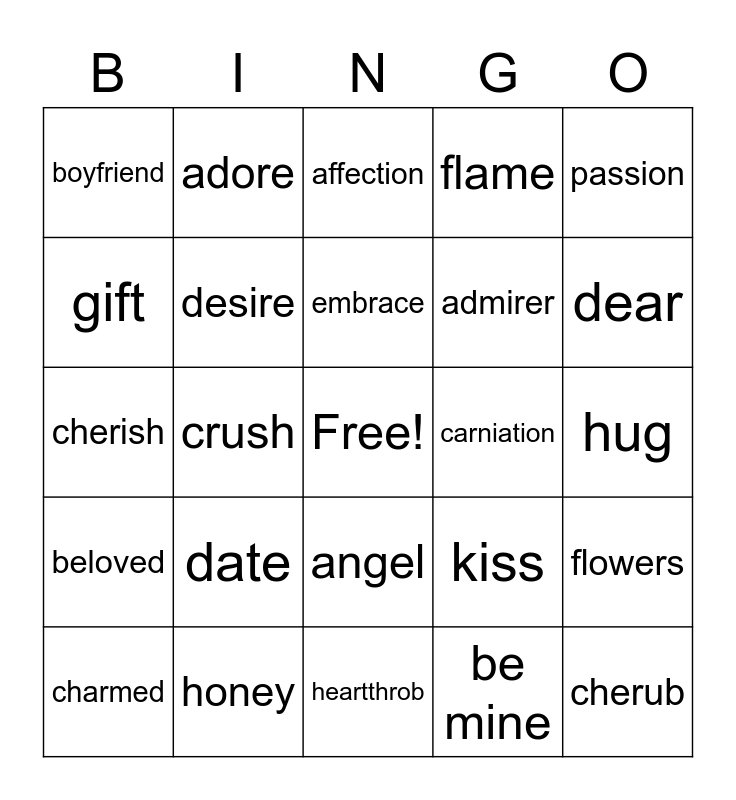This bingo card has a free space and 28 words: flowers, amor, admirer, be mine, gift, affection, adore, beloved, carniation, charmed, cherish, flame, honey, heartthrob, dear, darling, date, desire, embrace, angel, boyfriend, girlfriend, cherub, crush, hug, kiss, passion and romance.
