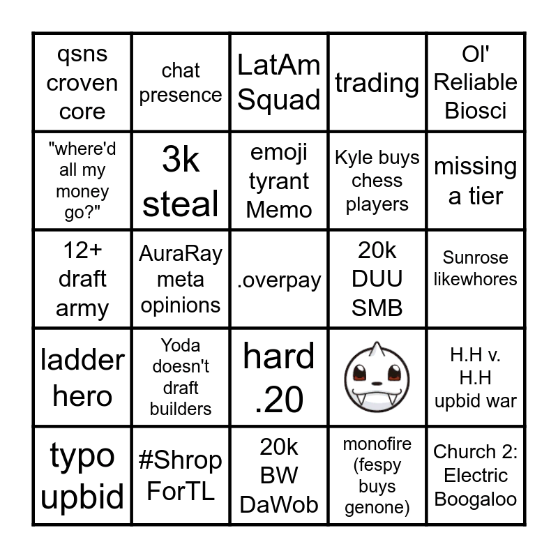 This bingo card has 1 images, a free space and 23 words: Yoda doesn't draft builders, #Shrop ForTL, emoji tyrant Memo, typo upbid, Ol' Reliable Biosci, qsns croven core, "where'd all my money go?", chat presence, 20k DUU SMB, hard .20, Kyle buys chess players, 12+ draft army, H.H v. H.H upbid war, 3k steal, monofire (fespy buys genone), Sunrose likewhores, LatAm Squad, missing a tier, AuraRay meta opinions, Church 2: Electric Boogaloo, ladder hero, trading and 20k BW DaWob.
