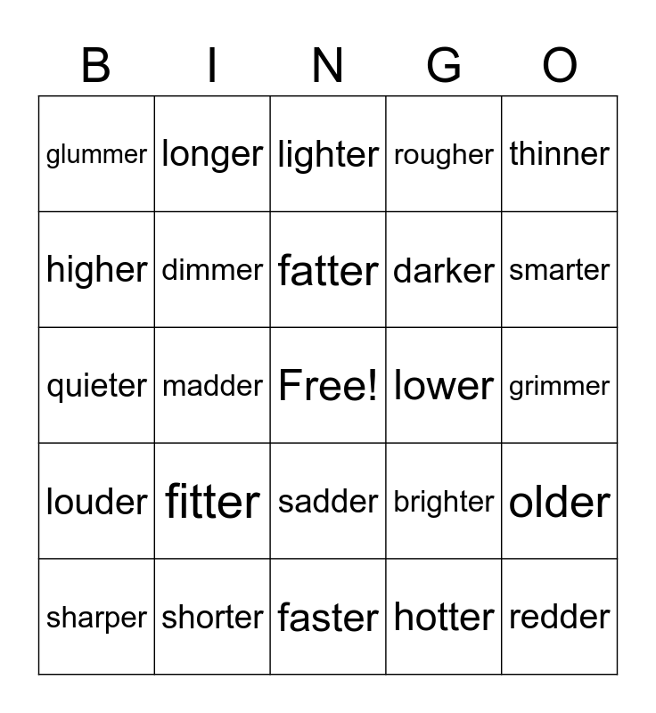 This bingo card has a free space and 27 words: brighter, colder, darker, faster, higher, lighter, longer, louder, lower, older, quieter, rougher, sharper, shorter, smarter, bigger, dimmer, fatter, fitter, glummer, grimmer, hotter, madder, redder, sadder, thinner and wetter.