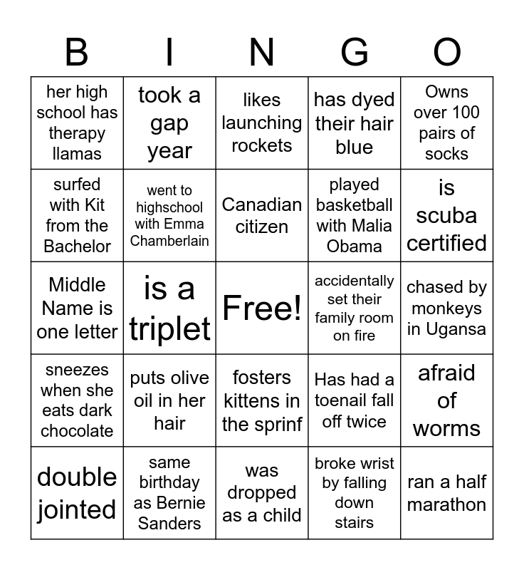 This bingo card has a free space and 24 words: puts olive oil in her hair, same birthday as Bernie Sanders, Canadian citizen, double jointed, Owns over 100 pairs of socks, her high school has therapy llamas, surfed with Kit from the Bachelor, took a gap year, accidentally set their family room on fire, fosters kittens in the sprinf, played basketball with Malia Obama, Middle Name is one letter, Has had a toenail fall off twice, afraid of worms, went to highschool with Emma Chamberlain, broke wrist by falling down stairs, chased by monkeys in Ugansa, likes launching rockets, is scuba certified, is a triplet, ran a half marathon, sneezes when she eats dark chocolate, has dyed their hair blue and was dropped as a child.