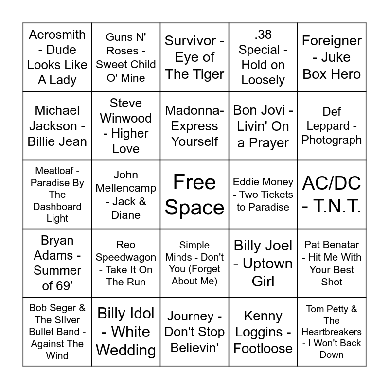 This bingo card has a free space and 24 words: Reo Speedwagon - Take It On The Run, Billy Idol - White Wedding, Madonna- Express Yourself, Bob Seger & The SIlver Bullet Band - Against The Wind, Foreigner - Juke Box Hero, Aerosmith - Dude Looks Like A Lady, Michael Jackson - Billie Jean, Guns N' Roses - Sweet Child O' Mine, Eddie Money - Two Tickets to Paradise, Simple Minds - Don't You (Forget About Me), Bon Jovi - Livin' On a Prayer, Meatloaf - Paradise By The Dashboard Light, Billy Joel - Uptown Girl, Pat Benatar - Hit Me With Your Best Shot, Steve Winwood - Higher Love, Kenny Loggins - Footloose, AC/DC - T.N.T., Survivor - Eye of The Tiger, Def Leppard - Photograph, John Mellencamp - Jack & Diane, Tom Petty & The Heartbreakers - I Won't Back Down, Bryan Adams - Summer of 69', .38 Special - Hold on Loosely and Journey - Don't Stop Believin'.