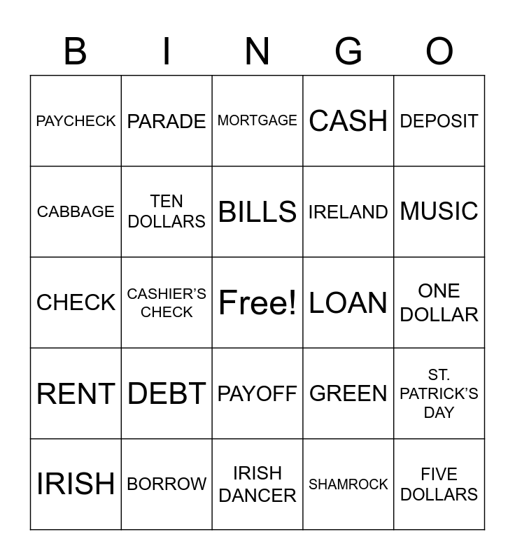 This bingo card has a free space and 40 words: MONEY ORDER, CHECK, COINS, TEN DOLLARS, BORROW, PAYOFF, BILLS, NO MONEY, DEPOSIT, RENT, CASHIER’S CHECK, CASH, FIVE DOLLARS, ONE DOLLAR, LOAN, DEBT, BROKE, PAYCHECK, EVERY MONTH, MORTGAGE, ST. PATRICK’S DAY, SHAMROCK, IRELAND, CABBAGE, GREEN BEER, PARTY, LUCK, POT OF GOLD, RED HAIR, GREEN HAT, LEPRECHAUN, IRISH, CORNED BEEF, GREEN, MUSIC, IRISH DANCER, RAINBOW, PINCH, PARADE and MARCH 17TH.