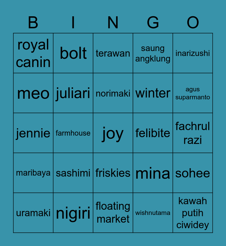 This bingo card has a free space and 24 words: sashimi, nigiri, norimaki, uramaki, inarizushi, royal canin, meo, bolt, felibite, friskies, winter, jennie, mina, sohee, juliari, wishnutama, fachrul razi, terawan, agus suparmanto, farmhouse, kawah putih ciwidey, maribaya, saung angklung and floating market.
