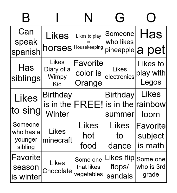This bingo card has a free space and 24 words: Likes minecraft, Likes Chocolate, Favorite color is Orange, Favorite season is winter, Has a pet, Can speak spanish, Has siblings, Likes horses, Birthday is in the summer, Likes hot food, Likes electronics, Likes to sing, Likes to dance, Favorite subject is math, Likes Diary of a Wimpy Kid, Likes flip flops/ sandals, Likes rainbow loom, Likes to play in Housekeeping, Likes to play with Legos, Birthday is in the Winter, Some one who is 3rd grade, Someone who has a younger sibling, Someone who likes pineapple and Some one that likes vegetables.