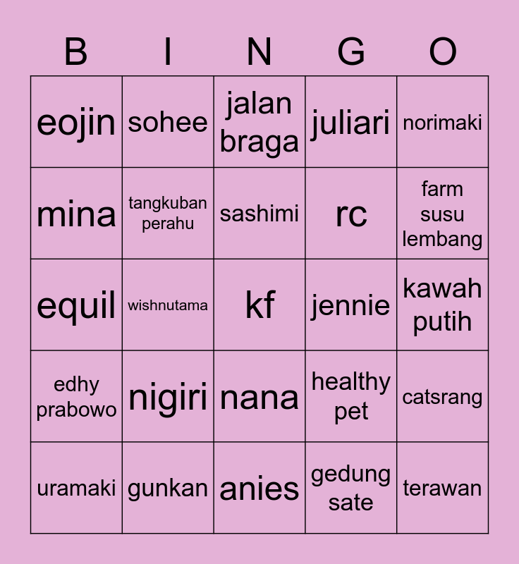 This bingo card has a free space and 24 words: nigiri, gunkan, sashimi, uramaki, norimaki, eojin, mina, sohee, jennie, nana, rc, equil, healthy pet, catsrang, tangkuban perahu, gedung sate, kawah putih, jalan braga, farm susu lembang, wishnutama, terawan, edhy prabowo, juliari and anies.