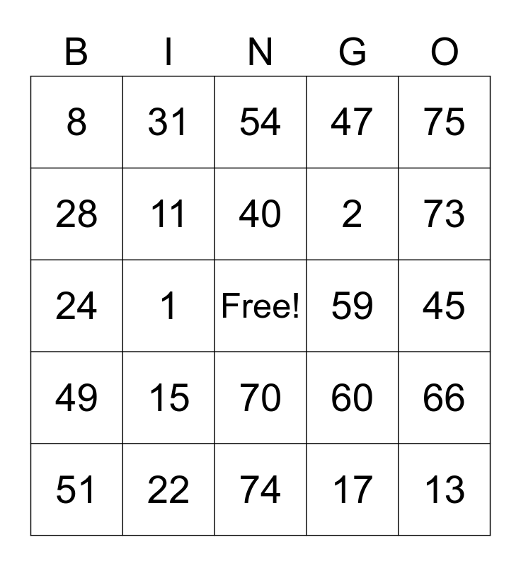 This bingo card has a free space and 24 words: 15, 22, 40, 51, 75, 8, 28, 31, 59, 70, 2, 24, 60, 66, 11, 17, 45, 54, 73, 1, 13, 49, 47 and 74.