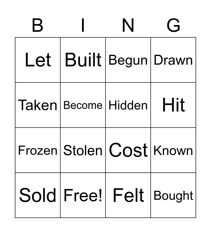 This bingo card has 28 words: Seen, Grown, Frozen, Gone, Become, Begun, Built, Bought, Free!, Caught, Cost, Drawn, Drunk, Fallen, Stolen, Found, Heard, Hidden, Hit, Sent, Let, Said, Sold, Known, Felt, Swum, Taken and Eaten.