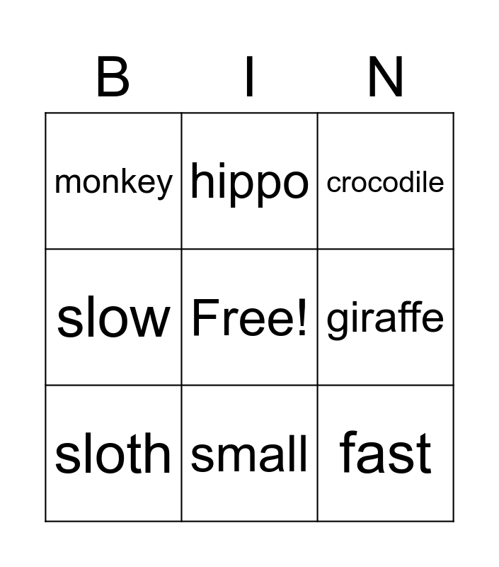This bingo card has a free space and 8 words: giraffe, crocodile, hippo, sloth, monkey, fast, slow and small.