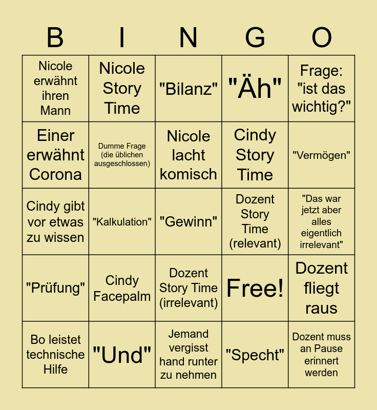 This bingo card has 25 words: Cindy Facepalm, Jemand vergisst hand runter zu nehmen, Nicole lacht komisch, Bo leistet technische Hilfe, Frage: "ist das wichtig?", Nicole erwähnt ihren Mann, Einer erwähnt Corona, Nicole Story Time, Dozent Story Time (relevant), Dozent Story Time (irrelevant), Cindy Story Time, Cindy gibt vor etwas zu wissen, Free!, Dozent fliegt raus, Dumme Frage (die üblichen ausgeschlossen), Dozent muss an Pause erinnert werden, "Das war jetzt aber alles eigentlich irrelevant", "Bilanz", "Vermögen", "Kalkulation", "Gewinn", "Und", "Prüfung", "Äh" and "Specht".