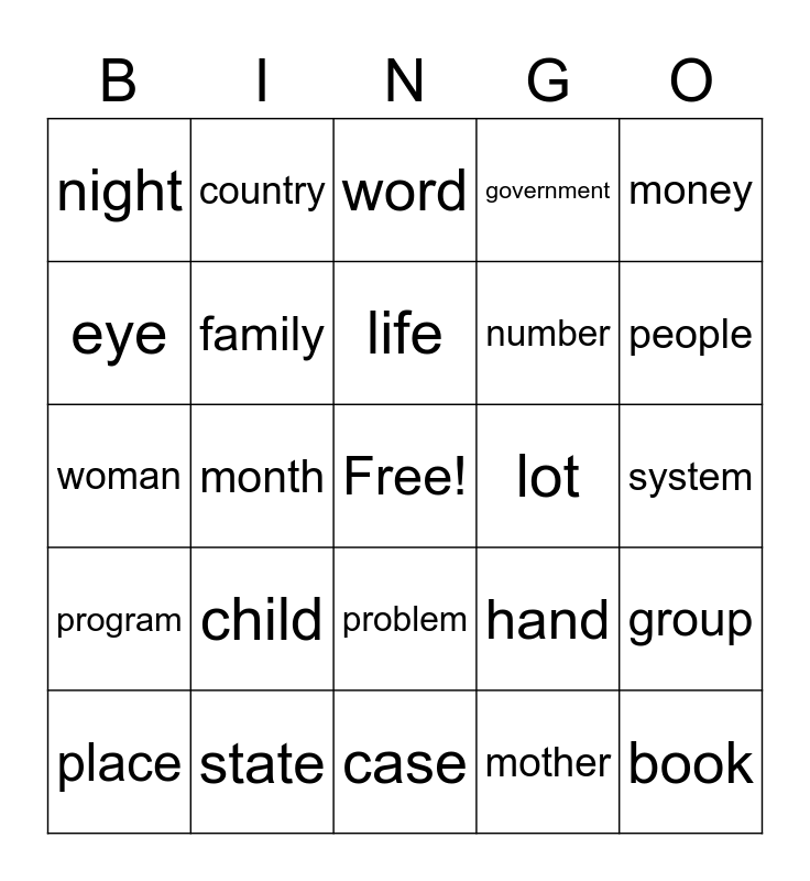 This bingo card has a free space and 49 words: area, book, business, case, child, company, country, day, eye, fact, family, government, group, hand, home, job, life, lot, man, money, month, mother, night, number, part, people, place, point, problem, program, question, right, room, school, state, story, student, study, system, thing, time, water, way, week, woman, word, work, world and year.