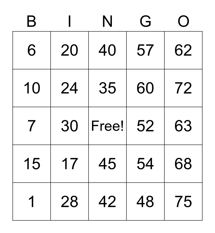 This bingo card has a free space and 24 words: 1, 17, 35, 48, 62, 6, 20, 40, 52, 63, 7, 24, 54, 68, 10, 28, 42, 57, 72, 15, 30, 45, 60 and 75.