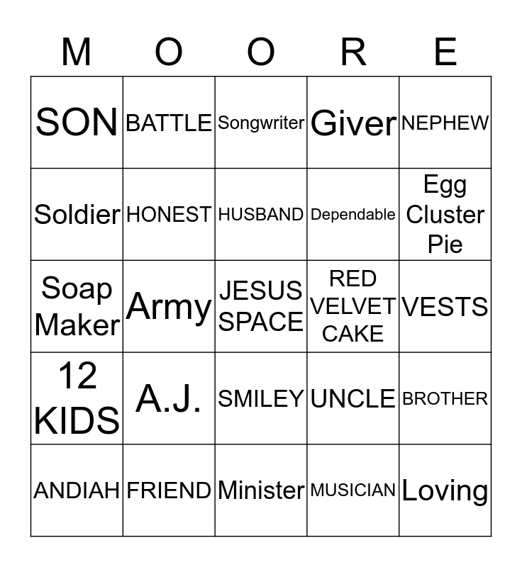 This bingo card has a free space and 24 words: A.J., FRIEND, HUSBAND, ANDIAH, NEPHEW, SON, Soldier, BATTLE, RED VELVET CAKE, SMILEY, Dependable, Soap Maker, UNCLE, BROTHER, HONEST, MUSICIAN, VESTS, Songwriter, Egg Cluster Pie, Army, Loving, 12 KIDS, Giver and Minister.