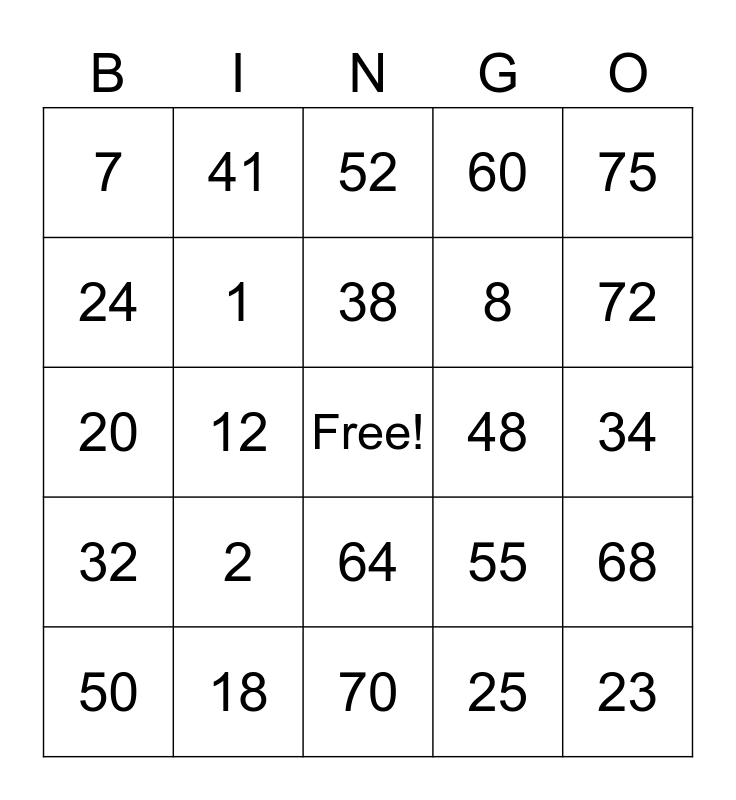 This bingo card has a free space and 24 words: 2, 18, 38, 50, 75, 7, 24, 41, 48, 64, 8, 20, 55, 68, 1, 25, 34, 52, 72, 12, 23, 32, 60 and 70.