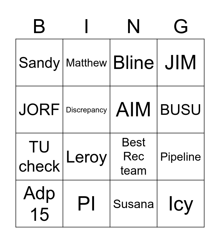 This bingo card has 45 words: Free!, Adp 15, PES, KYE, BELR, CWF, Bline, My Voice, JORF, Taleo, JIM, PI, PLI, PRIDE, PH, Shift-up, Shift-right, Best Rec team, CV, Leroy, Matthew, Ricky, Venus, Sandy, Flora, Susana, Astor, Eve, Joanne, Icy, Greta, Happy together, Stay connected, Campus talk, Sourcing, Pipeline, Bi-monthly meeting, TAG, FOW, BUSU, Discrepancy, TU check, PC code, AIM and Internal mobility.