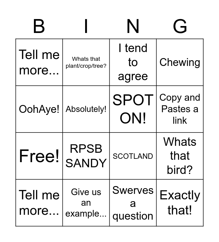This bingo card has 20 words: Whats that bird?, Dog barks, I tend to agree, SHEEP, Tell me more..., OohAye!, Give us an example..., Tell me more..., Free!, Whats that plant/crop/tree?, RPSB SANDY, SCOTLAND, Absolutely!, Exactly that!, SPOT ON!, The Farm, Copy and Pastes a link, Chewing, Swerves a question and Reference to previous home/job..
