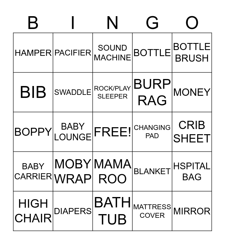 This bingo card has a free space and 31 words: BATH TUB, BABY MAT, BABY LOUNGE, HANGERS, HAMPER, SOUND MACHINE, SWADDLE, BLANKET, CHANGING PAD, MATTRESS COVER, CRIB SHEET, MIRROR, TOY BAR, GIFT CARD, MONEY, NURSING GOWN, HSPITAL BAG, MOBY WRAP, BABY CARRIER, MAMA ROO, BOTTLE BRUSH, HOOTER HIDER, HIGH CHAIR, PACIFIER, BURP RAG, BIB, BOTTLE, BOPPY, DIAPERS, ROCK/PLAY SLEEPER and CLOTHES.
