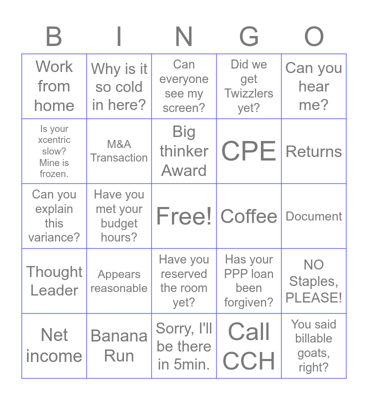 This bingo card has a free space and 58 words: Client Experience, Banana Run, Diversity, Inclusion and Equity, Thought Leader, Call CCH, Capital Advisors, M&A Transaction, FAC, CPE, Busy Season Dinners, Did we get Twizzlers yet?, Dual Authentication, Lunch and Learn, Emerging Practice, Open-item List, Work from home, You said billable goats, right?, Can you hear me?, Rebranding, Big thinker Award, Coffee, Can everyone see my screen?, Net income, NO Staples, PLEASE!, Business Leader, Document, Shoveling snow is so much fun! -no one ever, 40-hour work week... HA!, Returns, Valuation, Estimates, Trusted Business Advisors, Profit Sharing, What's the business attire?, Always have dress pants in your car, Yay! Food is here, The bathroom is closed, again., Have you met your budget hours?, Can you explain this variance?, Immaterial, pft, Appears reasonable, Are you having schema validation issues?, Has your PPP loan been forgiven?, Kaylee and her jokes, Has anyone seen Lynn?, Go check Yammer, Oh, someone is still in the Large, Have you reserved the room yet?, Sorry, I'll be there in 5min., Post your time!, When is happy hour?, Oh no, the door code changed again, *Beep Beep Beep* What's the new door code?, SADLY (if you know it, you know it), Why is it so cold in here?, I can't feel my hands, Is your xcentric slow? Mine is frozen. and Peabos on!.