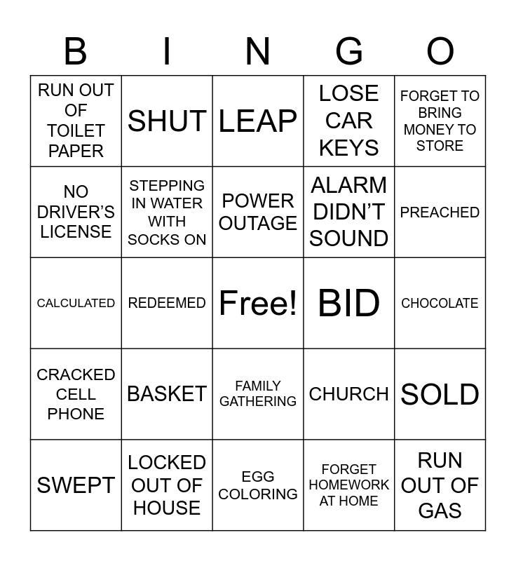 This bingo card has a free space and 60 words: FRUSTRATIONS IN LIFE, LOCKED OUT OF HOUSE, LOSE WALLET, CRACKED CELL PHONE, FORGET HOMEWORK AT HOME, HOLE IN SOCK, STEPPING IN WATER WITH SOCKS ON, CAR BREAK DOWN, ALARM DIDN’T SOUND, TRAFFIC ACCIDENT, LOSE CAR KEYS, LOCKED KEYS IN CAR, NO DRIVER’S LICENSE, DROP CALLS, SPILL FOOD ON NICE SHIRT, RUN OUT OF TOILET PAPER, RUN OUT OF GAS, FORGET TO BRING MONEY TO STORE, LATE FOR WORK, POWER OUTAGE, BID, LEAP, SWEPT, SOLD, BLESSED, SPENT, HURT, REVEALED, PREACHED, SCHEDULED, BENT, PLEAD, TOLD, SPOILED, SHUT, KNITTED, SPLIT, REDEEMED, SPIT, CALCULATED, EASTER, BASKET, CHOCOLATE, JELLY BEANS, CHURCH, EASTER DRESS, HAM, EASTER SUNDAY, CHICKS, FAMILY GATHERING, EGG COLORING, EASTER BUNNY, CANDY, SHEEP, EASTER HAT, EASTER OUTFIT, HOLIDAY, EASTER EGG HUNT, PASTEL COLORS and JESUS.