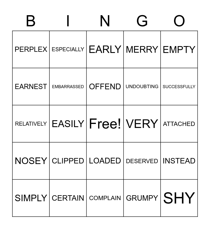 This bingo card has a free space and 60 words: AFFECTED, CERTAIN, SURPRISED, NOSEY, GRUMPY, INDECISIVE, EMBARRASSED, FRUSTRATED, UNDOUBTING, RESENTFUL, MERRY, LOVING, EARNEST, ATTRACTED, LUCKY, PERPLEX, SHY, EMPTY, USELESS, OFFEND, VERY, EARLY, SIMPLY, INSTEAD, ALMOST, POTENTIALLY, DIRECTLY, ELSE, SUCCESSFULLY, EXTREMELY, ANYWAY, SOMETIMES, GENERALLY, ACTUALLY, ESPECIALLY, ALREADY, THEREFORE, EASILY, CONSTANTLY, RELATIVELY, BOILED, CLIPPED, ATTACHED, DELAYED, DESERVED, EXTENDED, EMBARRASSED, INTERRUPTED, DECEASED, LOADED, COMPLAIN, ADVISED, BLEACHED, DOUBLED, DRIED, ENTERED, HUNTED, INVENTED, FOLDED and MARCHED.