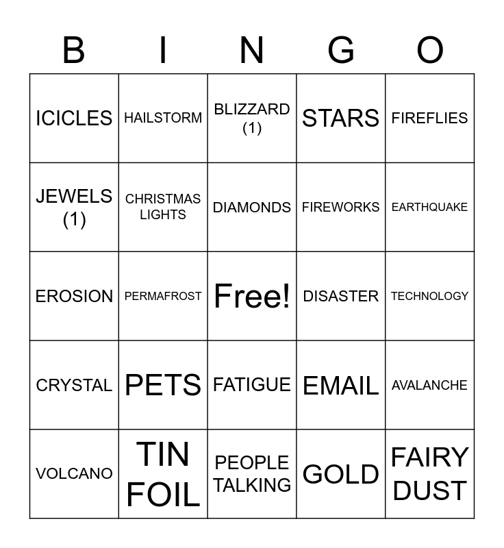This bingo card has a free space and 60 words: SEQUINS, TIN FOIL, CANDLES, CRYSTAL, GOLD, LIP GLOSS, CHRISTMAS LIGHTS, SUNLIGHT ON WATER, FIREWORKS, SILVER, STARS, GLITTER, JEWELS (1), RHINESTONE, FRESH SNOW (1), ICICLES, FAIRY DUST, FIREFLIES, CITY LIGHTS, DIAMONDS, DISASTER, BLIZZARD (1), VOLCANO, AVALANCHE, SANDSTORM, FLOOD, TREMOR, DROUGHT, EARTHQUAKE, BLACKOUT, FOREST FIRE, DUST STORM, HURRICANE, WHIRLPOOL, HAILSTORM, ARSON, CYCLONE, PERMAFROST, HEAT WAVE, EROSION, SOMEONE TAPPING A PENCIL, PETS, TECHNOLOGY, SMART PHONES, EMAIL, THOUGHTS, BEING UNPREPARED, NOISE, INTERRUPTIONS, FATIGUE, PEOPLE TALKING, EATING, DAYDREAMING, CLUTTER, SOCIAL MEDIA, MUSIC, PEOPLE, ROOM TEMPERATURE, HUNGER and WORK ENVIRONMENT (1).