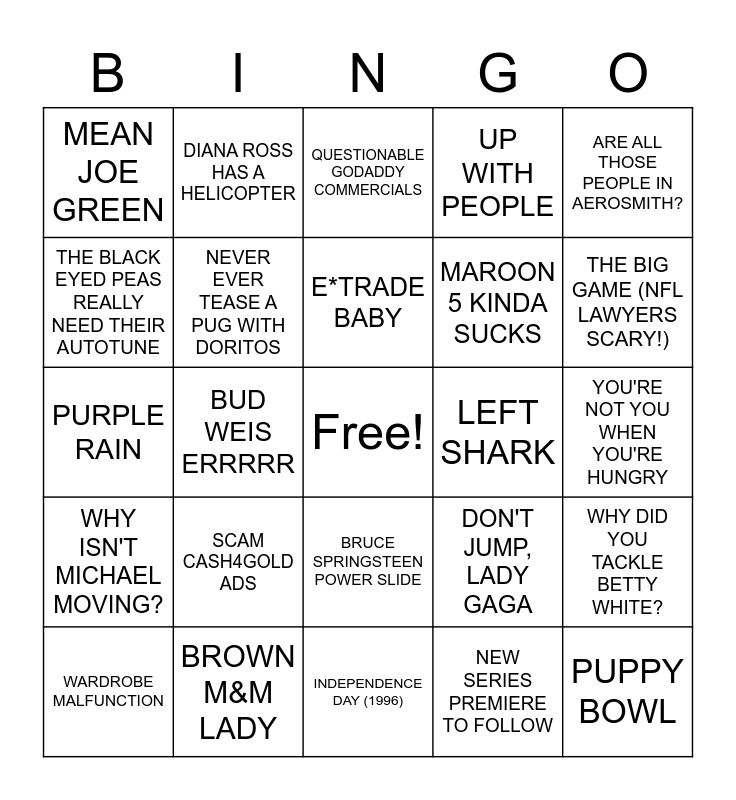 This bingo card has a free space and 29 words: WARDROBE MALFUNCTION, APPLE 1984 COMMERCIAL, BUD WEIS ERRRRR, WAZZZZ UUUUUUPPPP, MEAN JOE GREEN, QUESTIONABLE GODADDY COMMERCIALS, NEVER EVER TEASE A PUG WITH DORITOS, SCAM CASH4GOLD ADS, LEFT SHARK, BROWN M&M LADY, YOU'RE NOT YOU WHEN YOU'RE HUNGRY, PUPPY BOWL, INDEPENDENCE DAY (1996), NEW SERIES PREMIERE TO FOLLOW, THE BIG GAME (NFL LAWYERS SCARY!), RED HOT CHILI PEPPERS UNPLUGGED, BRUCE SPRINGSTEEN POWER SLIDE, WHY ISN'T MICHAEL MOVING?, ARE ALL THOSE PEOPLE IN AEROSMITH?, PURPLE RAIN, DON'T JUMP, LADY GAGA, DOES XTINA NOT KNOW THE TUNE TO THE STAR-SPANGLED BANNER?, MAROON 5 KINDA SUCKS, THE BLACK EYED PEAS REALLY NEED THEIR AUTOTUNE, UP WITH PEOPLE, DIANA ROSS HAS A HELICOPTER, WHY DID YOU TACKLE BETTY WHITE?, E*TRADE BABY and LOOK DOWN AT YOUR HAND. NOW BACK TO ME..