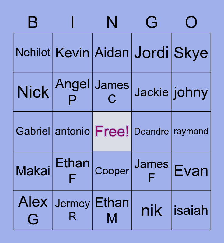 This bingo card has a free space and 24 words: Ethan F, Jermey R, James C, Alex G, Skye, Nehilot, Nick, Kevin, Deandre, Cooper, Jackie, Gabriel, James F, Evan, Angel P, nik, raymond, Aidan, johny, antonio, isaiah, Makai, Jordi and Ethan M.