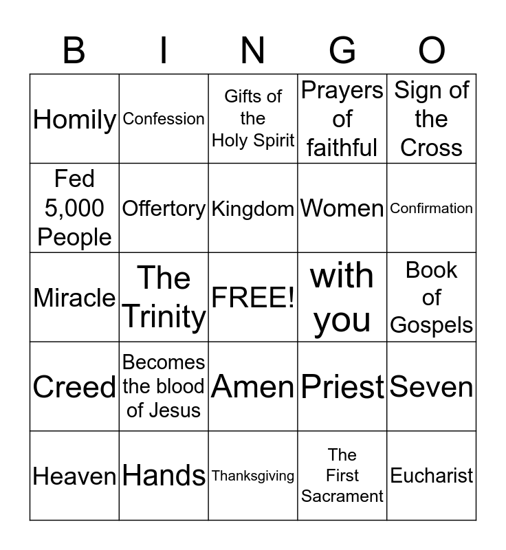 This bingo card has a free space and 42 words: Body of Jesus, Kingdom, Grace, Becomes the blood of Jesus, The First Sacrament, Seven, Eucharist, Last Supper, Gifts of the Holy Spirit, Amen, Book of Gospels, Confirmation, The Trinity, Sign of the Cross, Holy Orders, Priest, Altar Server, Miracle, Branches, Confession, Fed 5,000 People, Cross Bearer, Bible, Homily, Marriage, Heaven, Women, Also with you, Old Testament, New Testament, Amen, Creed, Offertory, Thanksgiving, Risen, Heaven, Hands, with you, Genuflect, Tabernacle, Prayers of faithful and Prayer.