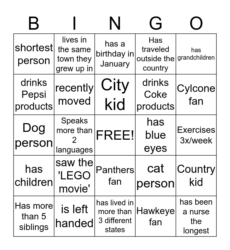 This bingo card has a free space and 29 words: Has more than 5 siblings, Was born outside the US, Speaks more than 2 languages, tallest person, shortest person, has a birthday in January, recently moved, saw the 'LEGO movie', has blue eyes, is left handed, Exercises 3x/week, has been a nurse the longest, has lived in more than 3 different states, Hawkeye fan, Cylcone fan, Drake fan, Panthers fan, has children, has grandchildren, Dog person, cat person, drinks coffee, drinks Coke products, drinks Pepsi products, Has traveled outside the country, lives in the same town they grew up in, Country kid, City kid and Small town kid.