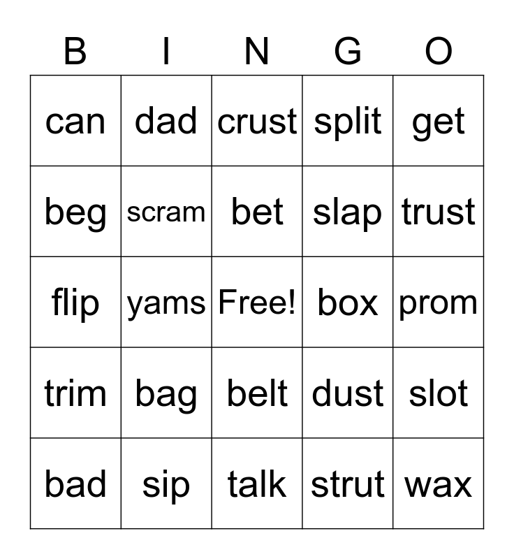 This bingo card has a free space and 24 words: bag, sip, bet, bad, get, can, beg, dad, box, belt, slap, flip, dust, slot, scram, strut, prom, crust, trust, yams, wax, trim, split and talk.