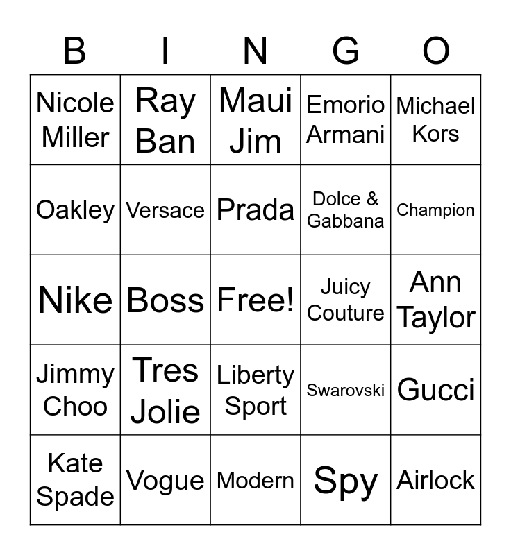 This bingo card has a free space and 28 words: Gucci, Coach, Dolce & Gabbana, Spy, Oakley, Maui Jim, Ray Ban, Jimmy Choo, Juicy Couture, Kate Spade, Nike, Emorio Armani, Vogue, Modern, Champion, Tiffany & Co., Tres Jolie, Versace, Prada, Liberty Sport, Nicole Miller, Flexon, Airlock, Boss, Ann Taylor, Swarovski, Michael Kors and Harley Davidson.