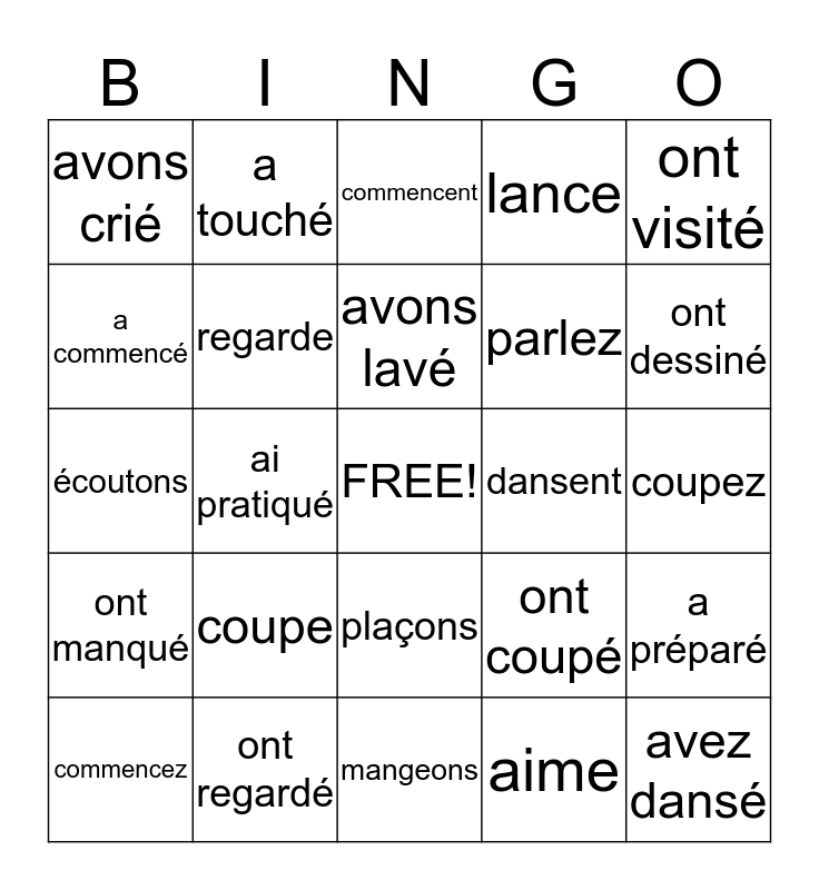 This bingo card has a free space and 61 words: a mangé, ont regardé, avez parlé, ont manqué, aime, manges, regarde, crions, parlez, jouent, lance, cries, a commencé, ai joué, as lancé, avons crié, avez dansé, ont visité, continuent, avons lavé, dansent, commencent, commencez, a préparé, préparons, corrige, ranges, a rangé, ont dessiné, avez rangé, ai visité, avons rangé, ont joué, a dansé, a touché, touchent, pratique, ai pratiqué, écoute, écoutons, écoutent, coupe, coupez, a coupé, ont coupé, chantes, chantons, as chanté, places, plaçons, mangeons, ai placé, avons brisé, brisent, achetes, achetez, a acheté, ont acheté, regardons, regardents and regarde.